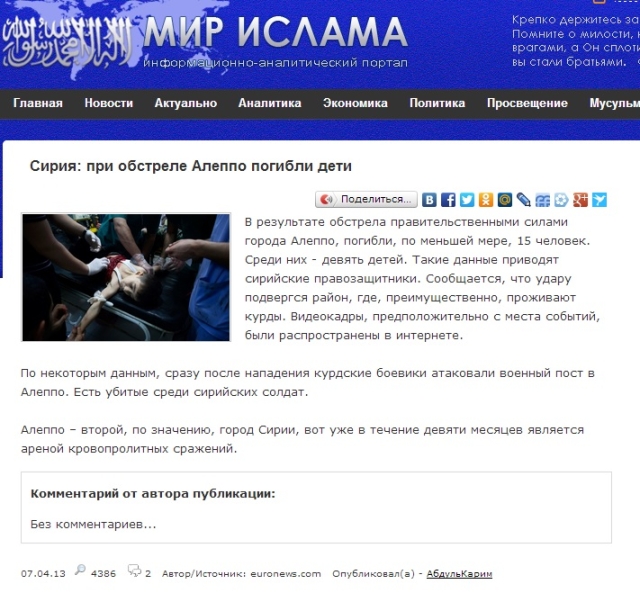 Тільки от справжня дата цього відео: 15 травня 2014-го і трапилося це у Сирії. Російські ЗМІ знову примудрилися прибрати вигуки “Аллах акбар” і видати кадри за Донецьк.