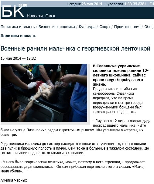 Найпоширенішою серед російських ЗМІ є спекуляція на дітях. Так у своєму Twitter 27 травня цього року журналістка російського каналу LifeNews Ерміна Котанджян опублікувала фото 8-річного хлопчика, який начебто загинув від рук українських військових в аеропорту Донецька. Більше того, вона посилається на фейкову сторінку “прокурора” Криму Наталії Поклонської.
