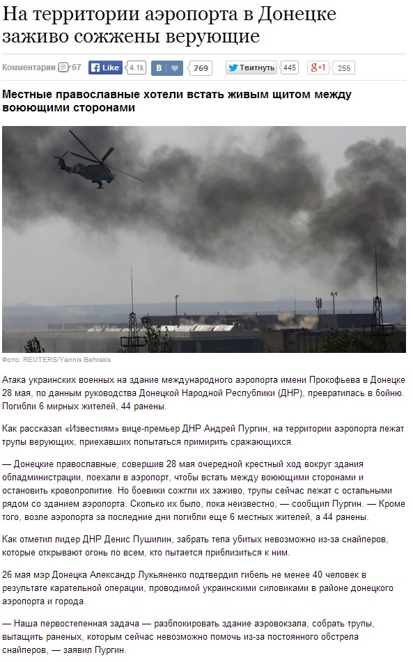 Серед російських ЗМІ, зокрема у виданні “Известия”, поширилася інформація, що у донецькому аеропорту згоріли віряни, які прийшли на летовище 28 травня, “аби не допустити кровопролиття”. Таку інформацію видання поширило із посланням на “віце-прем’єра” так званої “ДНР” Андрія Пургіна.