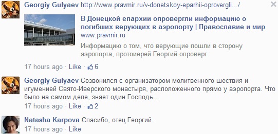 Згодом у Донецькій єпархії спростували саму ходу вірян до аеропорту, а відтак і їхнє спалення. Про це першим написав у соцмережах протоієрей Георгій Гуляєв, прес-секретар Донецької єпархії.