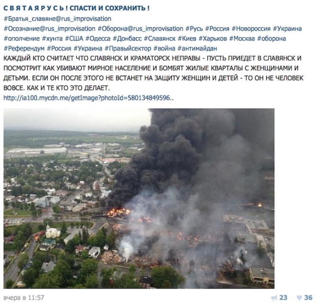 Групи сепаратистів у соцмережах поширили яскраву картинку про начебто потужні вибухи у Слов’янську, більше того, нібито у житлових кварталах, апелюючи до безпеки жінок і дітей. Кричущі тексти у супроводі до картинки поширилися на всі мережі.