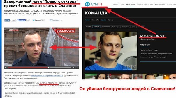 Феєричне за брехнею видання LifeNews першим дізнається про бійців “Правого сектору”, які буцімто приїхали на Донбас для дестабілізації ситуації. Один із таких “українських націоналістів”, “упійманих” на Донбасі, — насправді фітнес-тренер з Києва. Донецькі сепаратисти ж представили його Віталієм Ковальчуком — бійцем “ПС” з Вінниці.