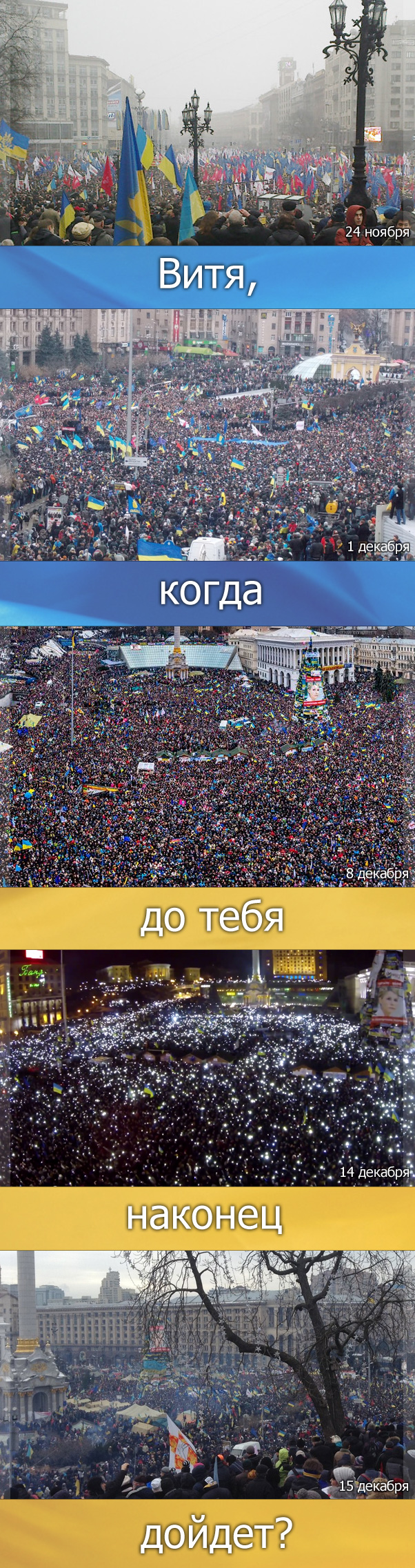 Народ ломится хоть тушкой в ЕС, в наивной надежде, что те уберут Янека, свора которого дожирает страну. Оппозиция стоит на баррикадах и не может выбрать между собой лидера. Майдан сейчас - это попытка смены власти, которая уже могла бы произойти, но не на что менять.