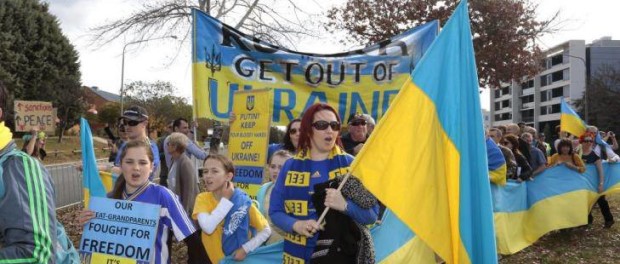 On the day of Ukrainian elections, hundreds of Ukrainians gathered outside the Russian embassy in Canberra on Sunday in protest against the Putin government’s occupation of the Crimean Peninsula and other eastern regions of Ukraine.