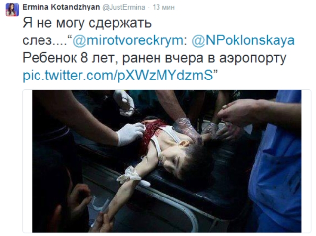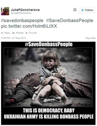 Найпоширенішою серед російських ЗМІ є спекуляція на дітях. Так у своєму Twitter 27 травня цього року журналістка російського каналу LifeNews Ерміна Котанджян опублікувала фото 8-річного хлопчика, який начебто загинув від рук українських військових в аеропорту Донецька. Більше того, вона посилається на фейкову сторінку “прокурора” Криму Наталії Поклонської.