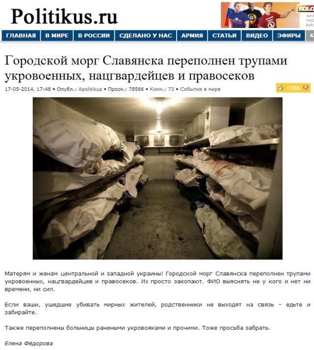 Низка російських ЗМІ, журналістів і блогерів опублікували фото буцімто з моргу Слов’янська із трупами українських військових й бійців Нацгвардії і “Правого сектору”. Їх начебто повинні “закопати” без ідентифікації.