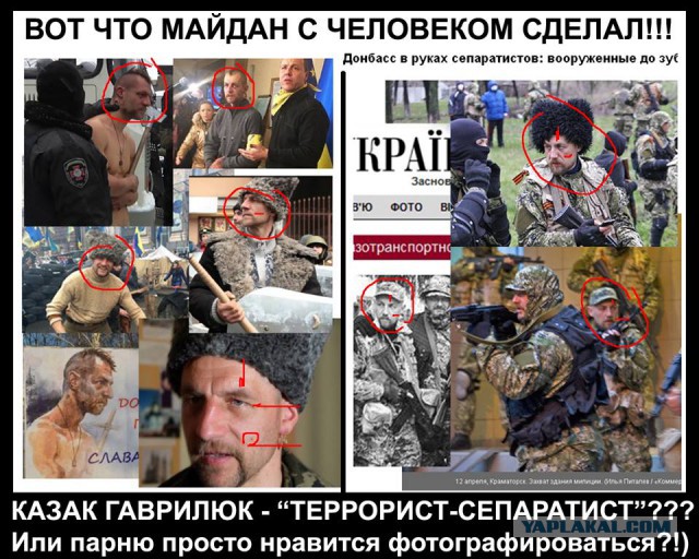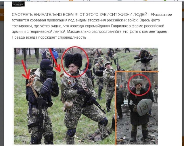 Активно сепаратисти поширюють й надуману інформацію про те, що буцімто козак з Євромайдану Михайло Гаврилюк став сепаратистом і тепер орудує на Донбасі. Навіть порівняльні таблиці уже склали. Але прорахувалися із зачіскою: сепаратист (ім’я якого Євген Пономарьов, який, до речі, активний у соцмережах) — майже лисий, тоді як у Гаврилюка — козацький чуб. Та й зморшки на чолі у диверсанта немає. Очевидно, “ідентифікували” по папасі.