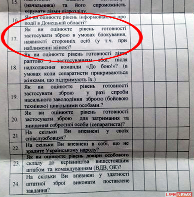 LifeNews намагалися аргументувати такі дані питаннями з психологічної анкети для українських військових, на які вони відповідають перед поїздкою на Донбас. Але журналісти видання, які, очевидно, погано володіють українською мовою, не прочитали уважно запитання. Мова йде про готовність стріляти не “у жінок”, а “за присутності жінок”.